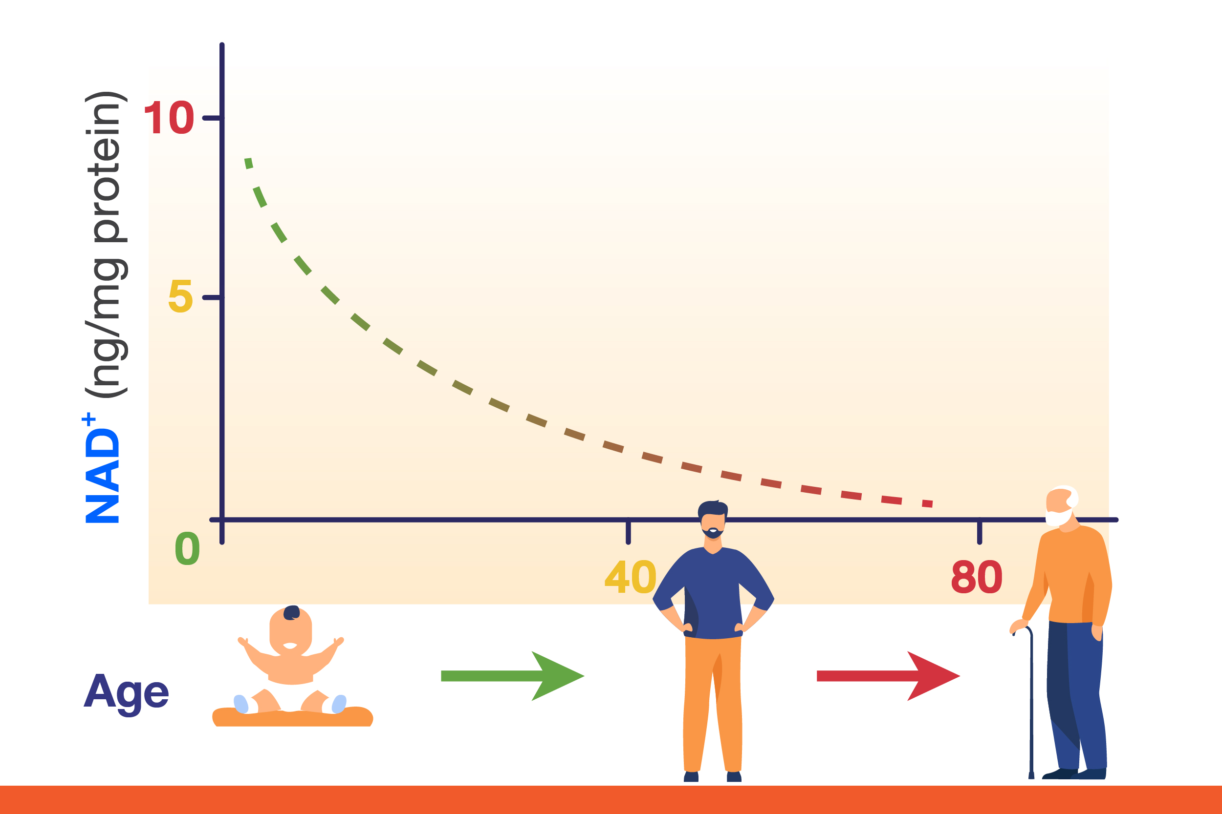 หากร่างกายของเรา มีระดับ NAD ที่ต่ำเกินไปจะเชื่อมโยงไปถึงปัญหาสุขภาพต่างๆ เช่นอาการอ่อนเพลีย ร่างกายทรุดโทรม ซึ่งร่างกายของเราจะสร้าง NAD ได้มากเมื่อยังเยาว์วัยและวัยเจริญเติบโต โดยจะลดลงเมื่อเข้าสู่วัยผู้ใหญ่และวัยสูงอายุ ซึ่งจากการศึกษาพบว่า ผู้ที่มีอายุ 50 ปี จะมีระดับ NAD ลดลง 50% จากตอนที่อายุ 20 ปี และเมื่ออายุได้ 70 ปี NAD จะเหลือเพียง 20% เท่านั้น และจะเหลือเพียง 1-10% เมื่ออายุ 80 ปี