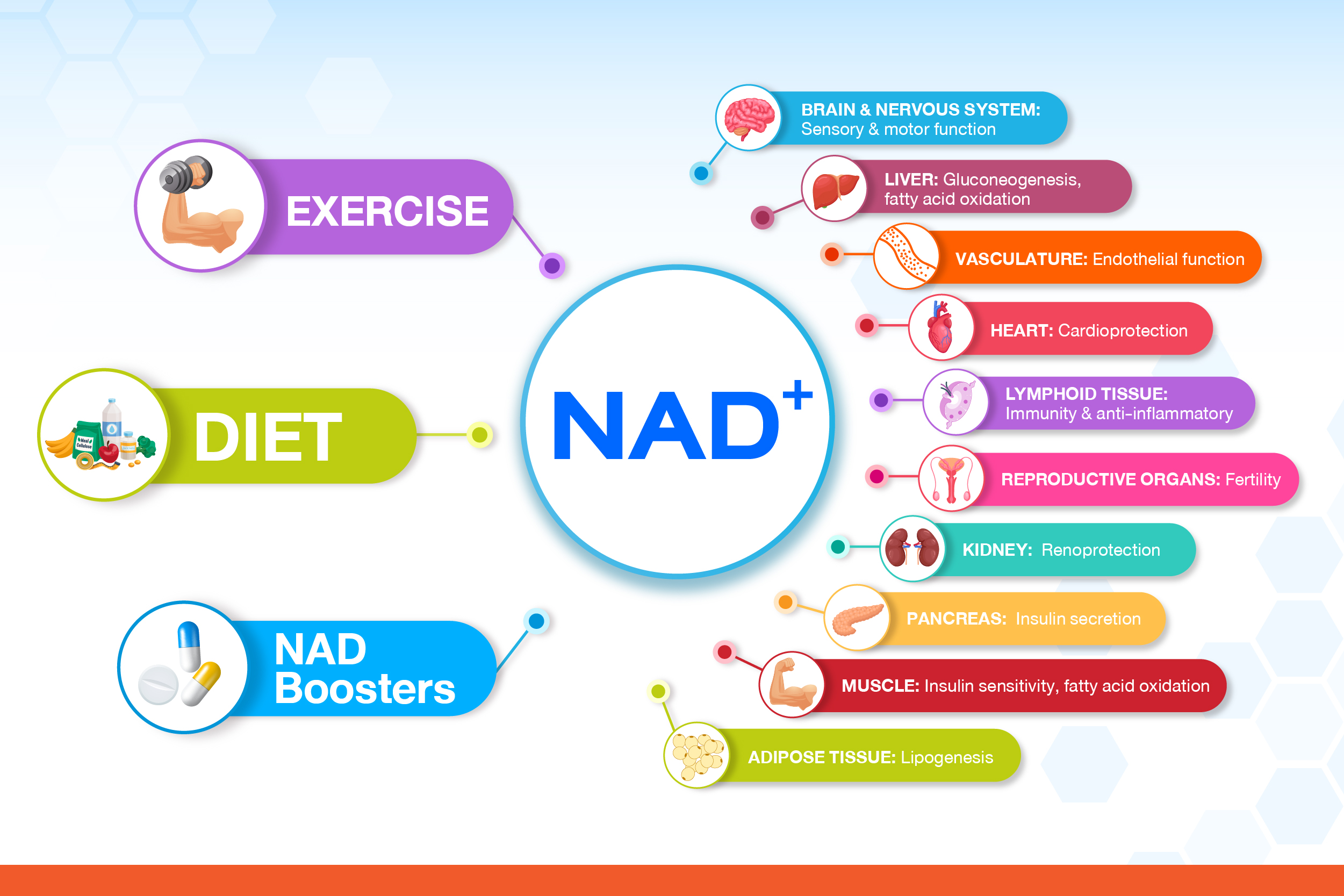NAD เป็นอนุพันธ์ของวิตามิน บี3 เป็นสารประกอบจากธรรมชาติ มีความจำเป็นต่อกระบวนการชีวเคมีเพื่อให้สิ่งมีชีวิตดำรงอยู่ได้โดยทำงานเป็นโคเอนไซม์ (CoEnzyme) อยู่ในทุกๆ เซลล์ทั่วร่างกายเป็นวัตถุดิบสำคัญในกระบวนการเผาผลาญเพื่อสร้างพลังงานให้แก่ทุกๆ เซลล์ (Metabolism)