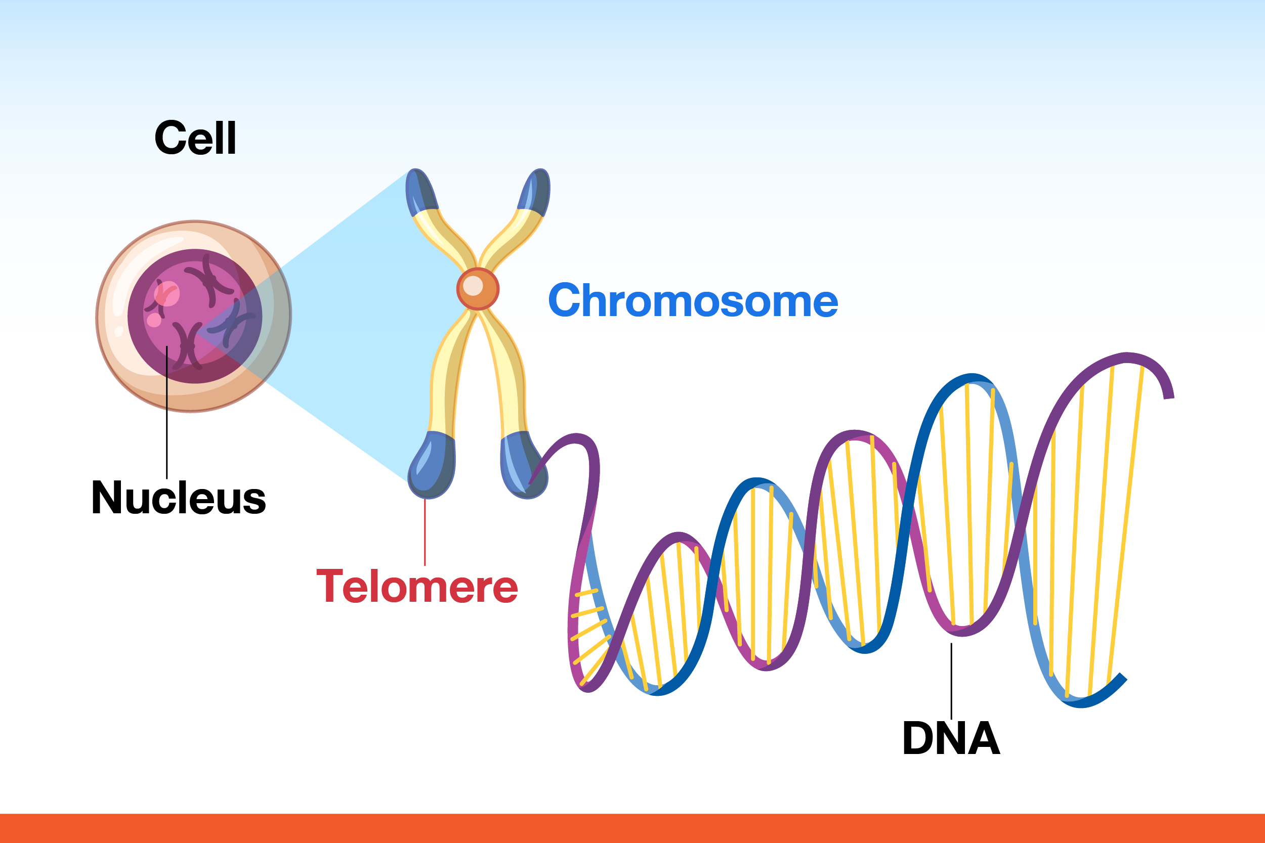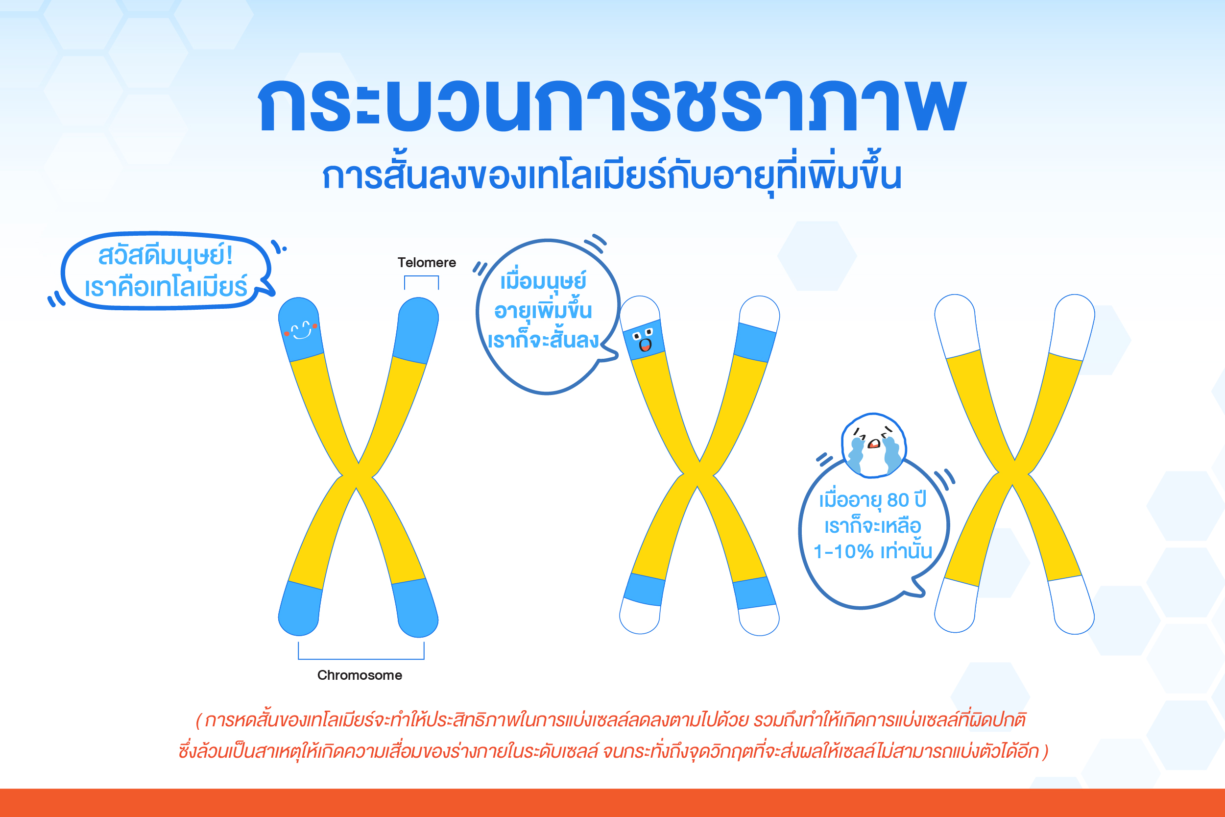 ในการแบ่งเซลล์แต่ละครั้งความยาวเทโลเมียร์จะหดสั้นลง 50-100 คู่เบส โดยคนอายุ 20 ปี มีความยาวเฉลี่ยอยู่ที่ 8 กิโลเบส เมื่อเข้าสู่อายุ 50 ปีจะเหลืออยู่ประมาณ 7 กิโลเบส และหากมีอายุถึง 100 ปีเหลือเพียง 4 กิโลเบส ซึ่งการหดสั้นของเทโลเมียร์จะทำให้ประสิทธิภาพในการแบ่งเซลล์ลดลงตามไปด้วย รวมถึงทำให้เกิดการแบ่งเซลล์ที่ผิดปกติ ซึ่งล้วนเป็นสาเหตุให้เกิดความเสื่อมของร่างกายในระดับเซลล์ จนกระทั่งถึงจุดวิกฤตที่จะส่งผลให้เซลล์ไม่สามารถแบ่งตัวได้อีก
