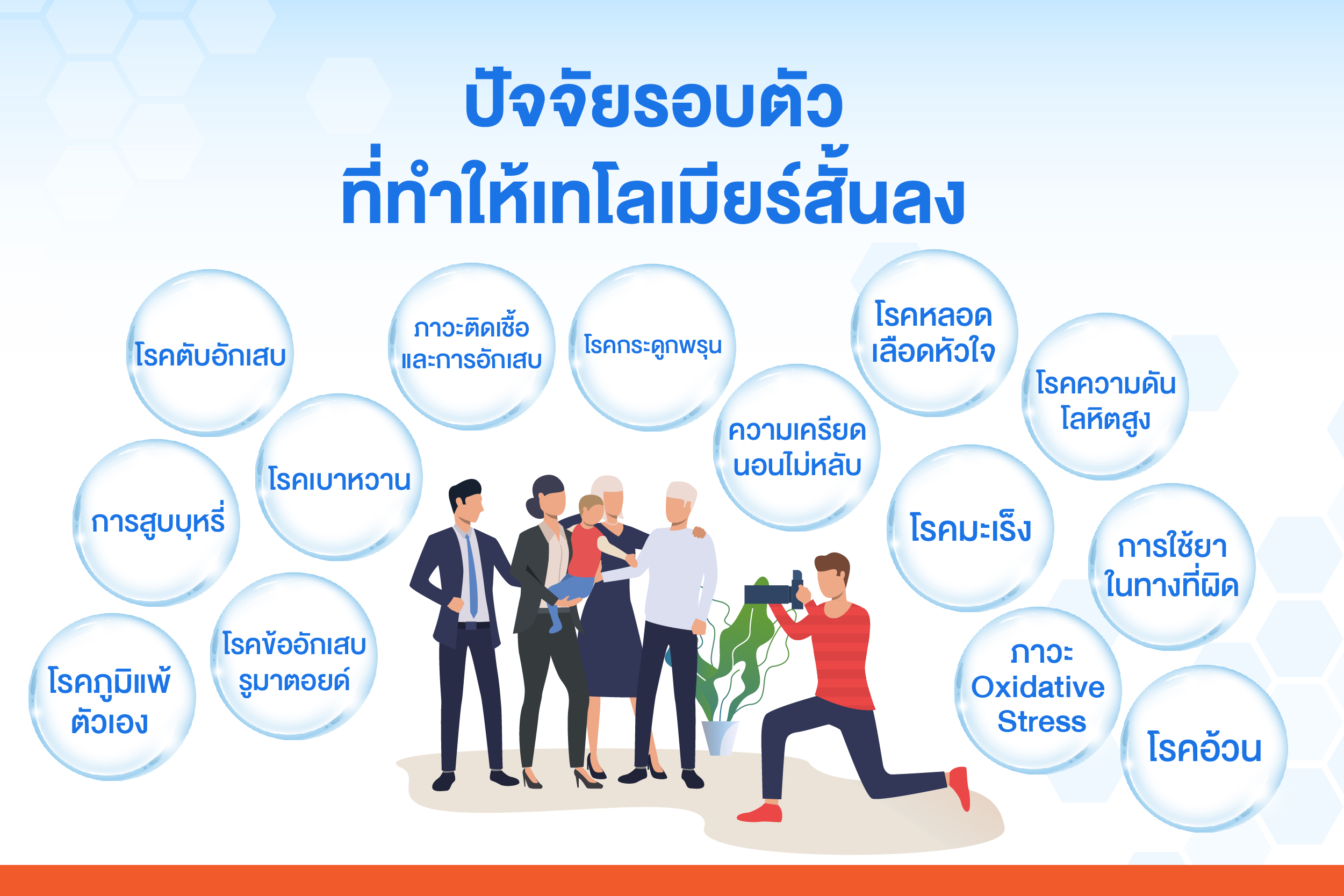 เทโลเมียร์ของเรานั้น มีการหดสั้นลงเรื่อยๆ ทุกวัน โดยนอกจากอายุที่เพิ่มขึ้นแล้ว ยังมีปัจจัยรอบตัวและการใช้ชีวิตเป็นส่วนสำคัญ เช่น การสูบบุหรี่, ความเครียด, นอนไม่หลับ, โรคเบาหวาน, โรคความดันโลหิตสูง, โรคหลอดเลือดหัวใจ, โรคอ้วน, โรคมะเร็ง, ภาวะ Oxidative Stress (อนุมูลอิสระในร่างกายสูง), ภาวะติดเชื้อและการอักเสบ, โรคตับอักเสบ, โรคภูมิแพ้ตัวเอง, โรคกระดูกพรุน, โรคข้ออักเสบรูมาตอยด์, การใช้ยาในทางที่ผิด เป็นต้น