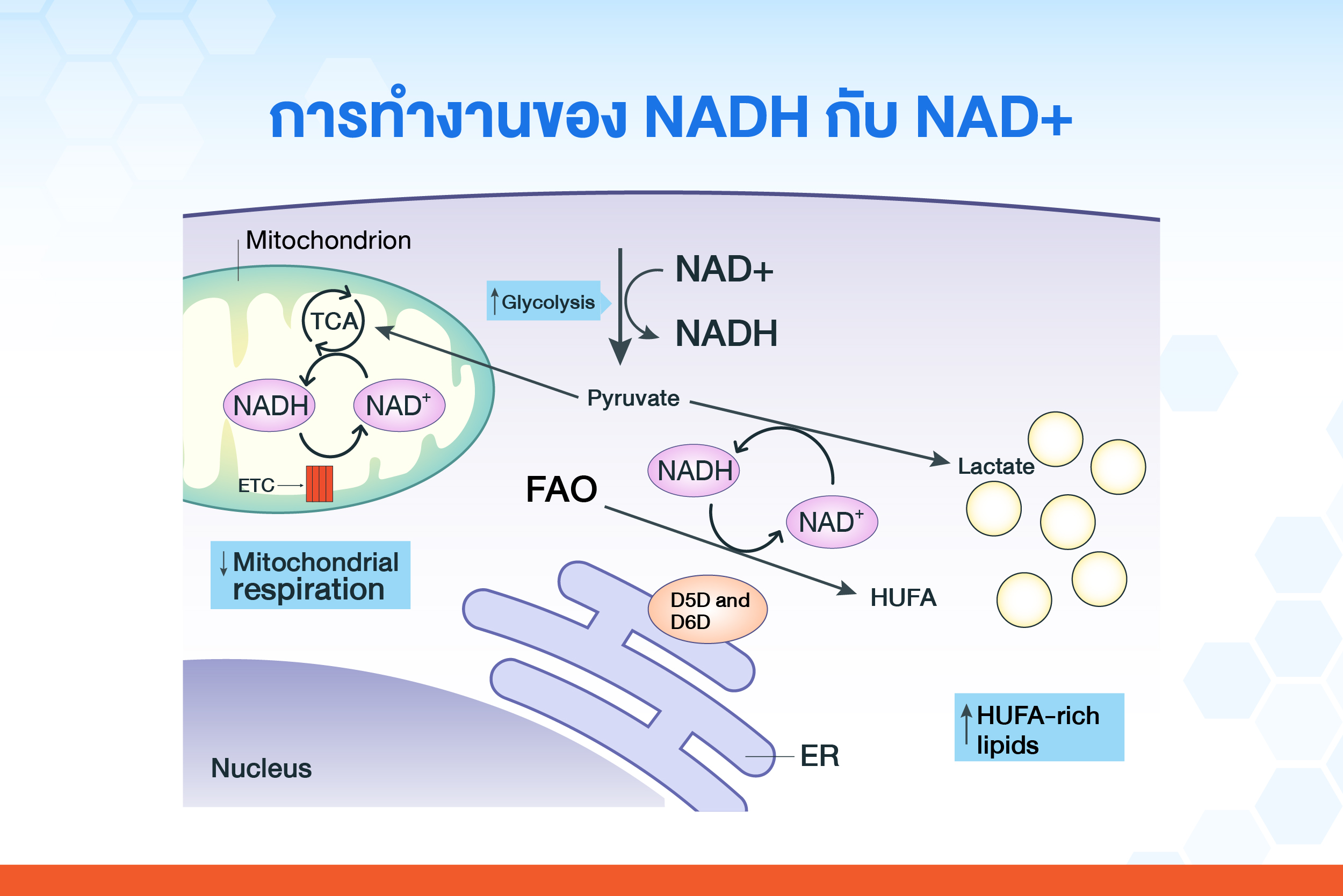 NAD นั้นจะทำงานในรูปแบบของ NADH (Reduced form) และ NAD+ (Oxidized form) ซึ่งเปรียบได้กับเหรียญคนละด้าน กลับไปกลับมา แต่ทำหน้าที่เดียวกันในการสร้างพลังงานในไมโตครอนเดรียในเซลล์ต่างๆ ของร่างกาย